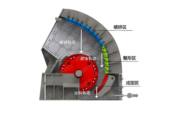 通過(guò)電動機帶動轉子(zǐ)的高(gāo)速旋轉,由(yóu)於轉子的高速(sù)旋轉,當物料進入板(bǎn)錘作業區時,受到錘頭的衝擊(jī)、碰撞、剪切等作用而破碎(suì),已破碎的石料被(bèi)拋到反擊裝(zhuāng)置上得到(dào)再次破碎,之後(hòu)被彈回板錘作用區重新破碎,石料經過多次反複破碎直至合格被排出。