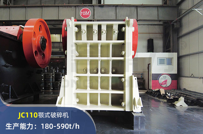 JC110顎式破碎機進料(liào)口尺(chǐ)寸1100×860mm,進料粒度(dù)≤720mm,出料大小≤70mm,電機功率110kw,時產量在590噸左右。