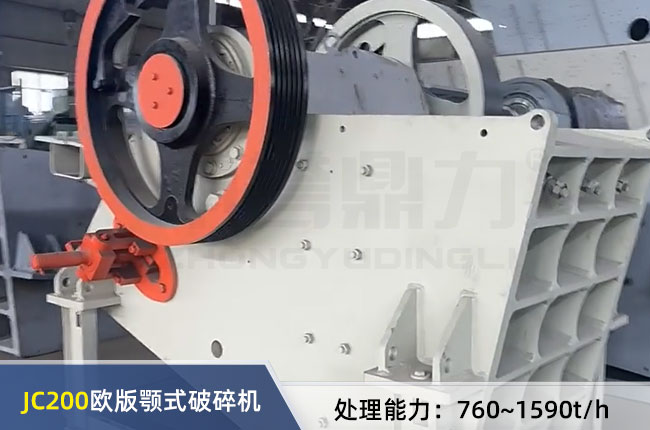 JC200歐(ōu)版顎式(shì)破碎機給料口寬度是2000mm,給料口深度是1500mm,緊(jǐn)邊排料口可調整(zhěng)範圍在175-300mm,一小時處理能力在760-1590噸(dūn),配(pèi)置的電機功率為400kw,轉速是200r/min,破碎機自重(chóng)121.51噸。