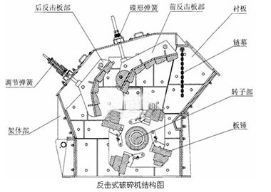 結構組成:反擊式破碎機(jī)主要由破碎機(jī)轉子、主軸、破碎板錘、反擊板、反擊彈簧裝(zhuāng)置、反擊護板等主要部件組成(chéng)。