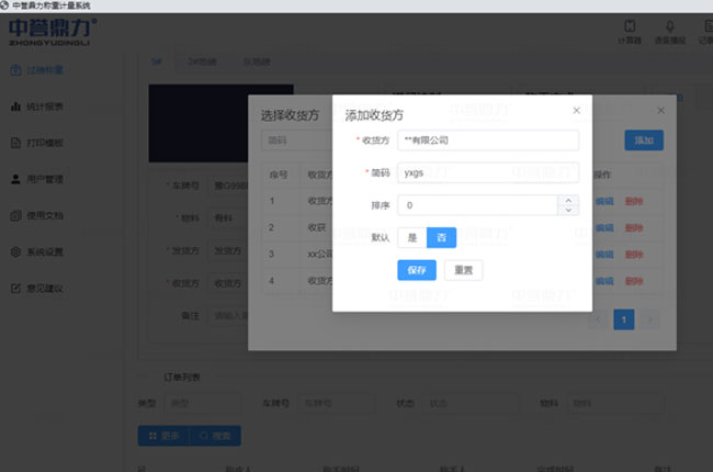 過磅稱重係統添加收貨單位,在收貨方文本欄雙擊,即可更換或新增收貨方,簡碼默認為收貨方拚音首字母簡拚,自動生成(chéng),個根據需求設置排序方式,支持(chí)默認項設(shè)置,操作更便(biàn)捷(jié)。