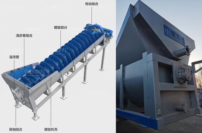 絞龍(lóng)洗沙機水裏(lǐ)那頭無傳動組,屬於螺旋洗砂機的尾部,尾部軸(zhóu)承外置於水槽(cáo)外,避免髒水汙(wū)染軸承。整機傳動組合在高處,通過電機(jī)和減速器帶動軸承旋(xuán)轉,葉輪翻轉。