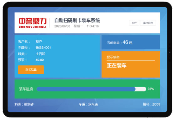 車輛稱毛重結束後,會開始砂(shā)石骨料的自(zì)動裝車環節,砂石(shí)料裝車係統語音(yīn)提示”開始自動裝車,裝載物料規格為XX”,裝車係統會將散裝頭根據車輛(liàng)高度自動調節至合適高度,便開始(shǐ)自動卸(xiè)料裝車。裝車結束後(hòu)係統語音提(tí)示“裝車(chē)完成“,散裝(zhuāng)頭會自動(dòng)上升(shēng)至設定位置。此環節裝載重量會通過顯示屏在司機可視範圍內(nèi)實時顯示,並且也會有監控係統抓拍留證。
